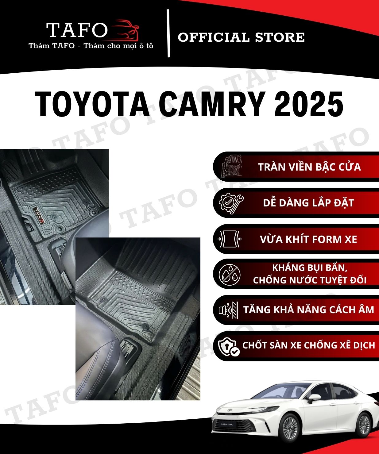 Với những ưu điểm vượt trội kể trên, thảm lót sàn ô tô Toyota Camry 2025 Tafo xứng đáng là lựa chọn hàng đầu cho không gian nội thất xe của bạn. Mọi thắc mắc hoặc đặt mua sản phẩm, vui lòng liên hệ hotline 08.1234.2628 để được tư vấn tận tình!